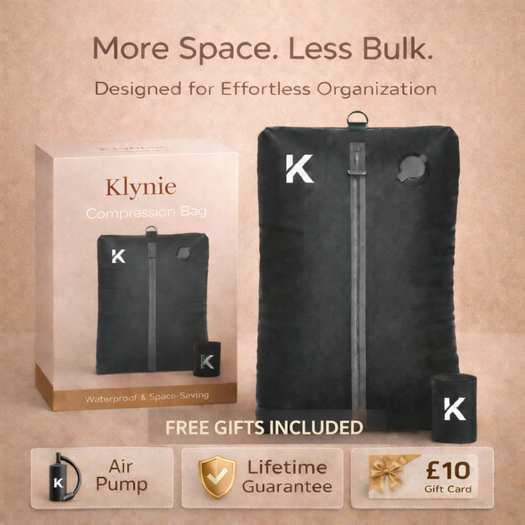Stop choosing between “packing light” and “bringing what you need”. Klynie™ saves up to 60% space, fits inside cabin bags, and compresses 15–20 items fast with the included USB-C rechargeable pump. Free UK shipping • 4–6 working days • 100 days to return, no questions asked.